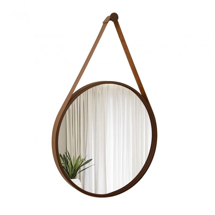 Espelho Decorativo Adnet Marrom Alça Corino Caramelo 60cm Redondo Marrom/Caramelo, 60 cm