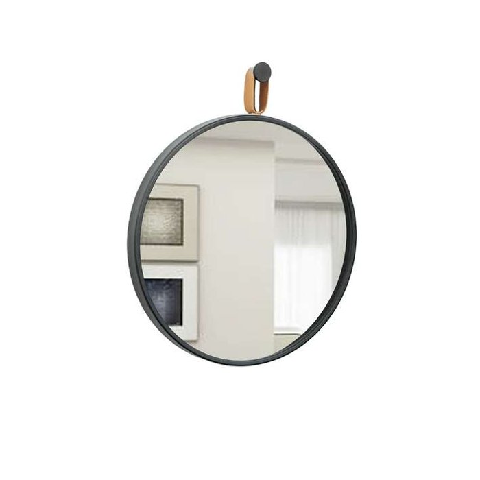 Espelho Decorativo Short Strip Preto Alça Corino Caramelo 50cm Redondo Preto/Caramelo, 50 cm