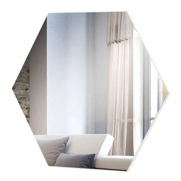 - Espelho decorativo Logus com espelho no formato de hexagono, no tamanho medio, na cor offwhite;