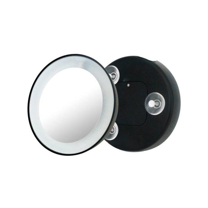 Espelho de aumento iluminado 15x com três ventosas que aderem a qualquer superfície espelhada ou de vidro. Funciona com 4 baterias tipo “botão de lítio”