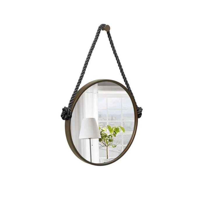 Espelho Marrom Alça Corda Naval Preta 50Cm Redondo 50 Cm