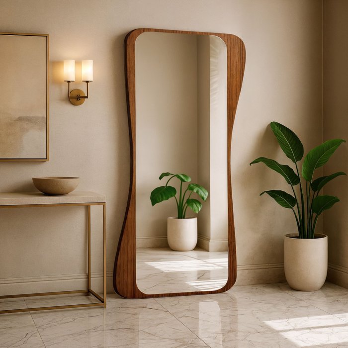O espelho de chão Encanto é um toque de designer e sofisticação para seu lar, sendo uma opção moderna e autentica de decoração, item para Halls, salas, quartos, closet e ínfinitas ambientes.Sua estrutura 100% MDF Cinamomo 16MM oferece beleza e resistência e segurança em seu uso, podendo ser apoiado no chão, mesma em casas que possuem crianças e Pets. Possuindo no apoio um suporte antiderrapante para sua maior segurança e comodidade. Além de possuir um suporte fixação na parede. O espelho 3mm lapidado e polido em cnc de altíssima qualidade, não distorce imagem.