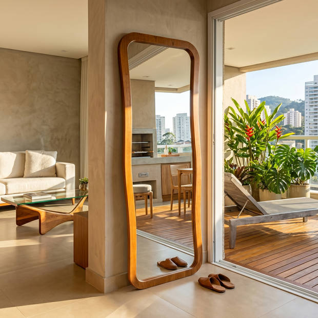 Com design moderno e elegante, nosso espelho de 180x60 cm é perfeito para valorizar a decoração e ampliar visualmente o ambiente. Seu formato levemente orgânico com cantos arredondados cria um visual contemporâneo, enquanto a moldura em MDF com acabamento amadeirado adiciona sofisticação e aconchego ao espaço. Ideal para salas, quartos, closets, corredores ou hall de entrada, o espelho de corpo inteiro permite uma visualização completa, além de refletir melhor a iluminação natural, deixando o ambiente mais amplo e iluminado.