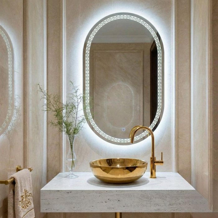* Espelho Oval Base Reta Jateado FLORAL com 3 Tons de LED + Botão Touch + Fonte SLIM (Ultra Compacta)