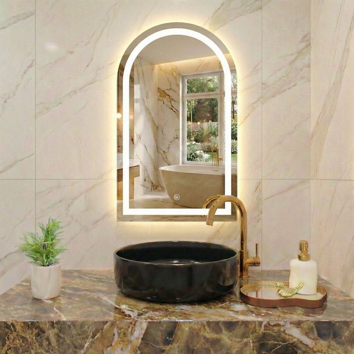 Espelho Oval Base Reta Jateado com 3 Tons de Led + Botão Touch + Fonte Slin (ultra compacta, já colada atrás do espelho – nada daquela fonte grande e aparente!).