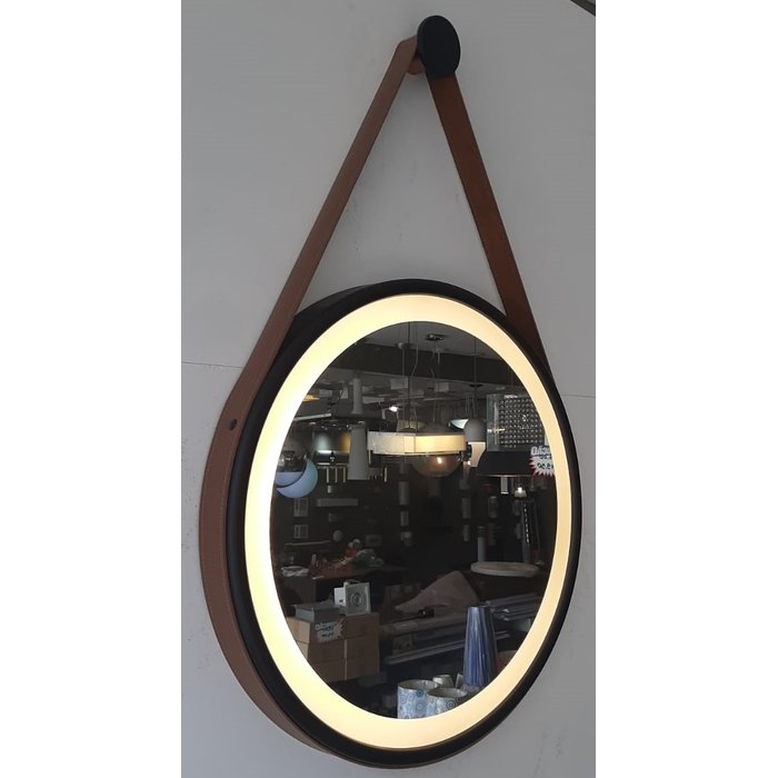 Espelho Redondo Adnet Led 60cm com Suporte Preto e Alça em Couro Ecológico Escandinavo Decorativo
