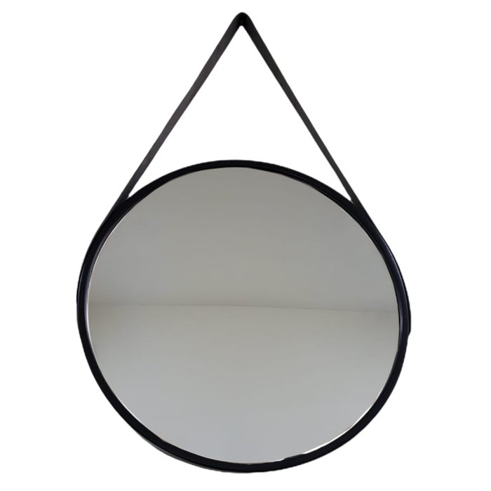 Espelho Redondo Preto com Alça de Couro Espelho redondo com alça suspenso decorativo 43 cm. com um design super moderno. Tenha um espelho da moda super em alta! Ideal para colocar em qualquer ambiente, salas, quartos, banheiros, escritórios e hall! O espelho ajuda a dar impressão de amplitude ao cômodo. Este espelho não acompanha o pino/suporte de fixação.