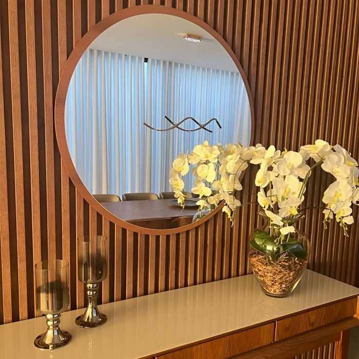 O Espelho Redondo tem se tornado tendência de decoração! Sua moldura é feita de MDF com acabamento laminado, garantindo durabilidade e sofisticação. Além de sua beleza estética, a escolha cuidadosa dos materiais assegura resistência e longevidade. Este espelho é um item indispensável para a decoração, graças à sua estrutura minimalista e design contemporâneo, que conferem um charme extra a qualquer ambiente. Sua adaptabilidade permite explorar infinitas possibilidades de decoração, criando atmosferas personalizadas e únicas.