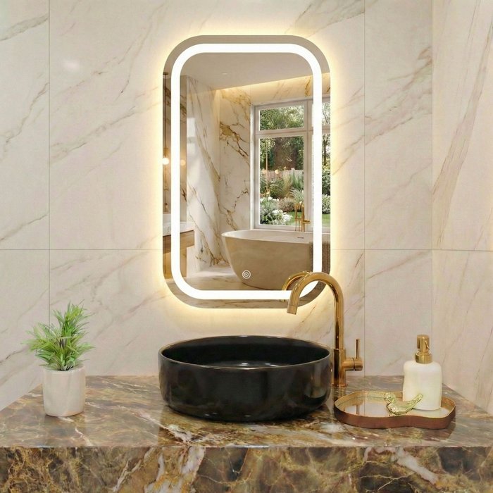 Espelho Retangular Jateado com Cantos Arredondados e LED em 3 Tons de Luz