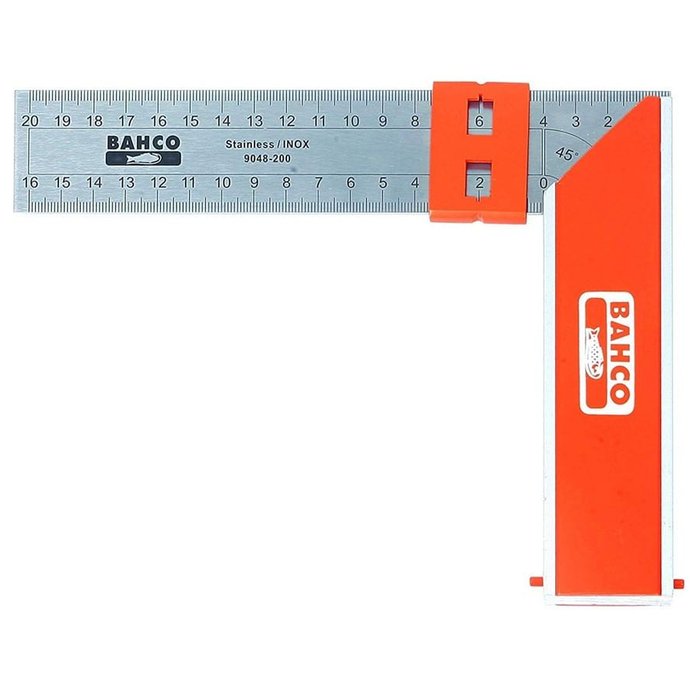 Esquadro tradicional Bahco 9048-200, com guias de ângulo de 90 e 45 graus. Acompanha indicador removível, que facilita a marcação e medição exata na peça de trabalho. A lâmina é de aço inoxidável, com precisão de 0,1 / 100 mm.