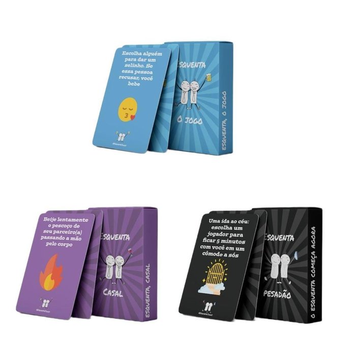 Kit composto pelos jogos :O Jogo:O clássico nunca pode faltar, o nosso primeiro jogo, o melhor de todos para jogar com os amigos na resenha e criar aquele cria descontraído e divertido, são 55 cartas para se divertirConteúdo:- 55 Cartas feitas de Papel Cartão Laminado ( resistente à água )- 1 Manual de instruções- 1 Caixa do jogoCasal:O novíssimo Esquenta, Casal Um jogo picante para esquentar seu relacionamentoConteúdo:- 55 Cartas feitas de Papel Cartão Laminado ( resistente à água )- 1 Manual de instruções- 1 Caixa do jogoPesadão:Chegou o Esquenta Pesadão, o jogo que vai acabar com a dignidade de todo mundo na resenha, são 55 cartas, uma mais pesada que a outra, e aí, vai perder a chanceConteúdo:- 55 Cartas feitas de Papel Cartão Laminado ( resistente à água )- 1 Manual de instruções- 1 Caixa do jogo