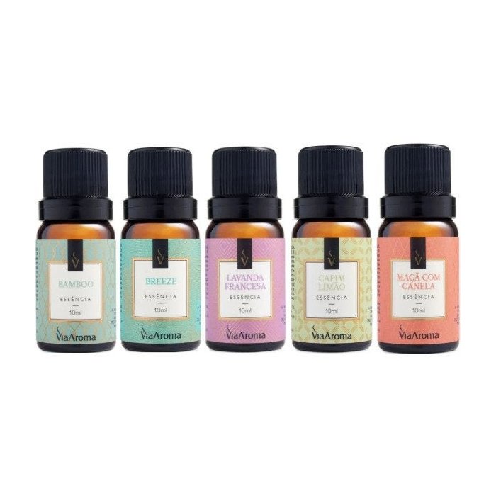 Kit com 5 Essências Mais Vendidas Via Aroma-Essências de qualidade, concentradas, original Via Aroma-Base oleosa, solúvel em agua ou álcool de cereais-Ideal para usar em difusores elétricos a calor e ultrassônicos-Próprio para você fazer seu difusor de varetas, sprays, água de lençol, sabonetes, velas, água perfumada;*Essência aromatizante, não possui efeito terapêutico.Itens do Kit1 Essência Bamboo 10ml1 Essência Breeze 10ml1 Essência Lavanda Francesa 10ml1 Essência Capim Limão 10ml1 Essência Maçã com Canela 10mlCaracterísticas dos Aromas-BambooAroma equilibrado de folhas verdes com toque cítrico do bambu. Alegre e intenso proporciona sensação de bem-estar e harmonia, sendo ideal para causar no ambiente uma atmosfera leve e refrescante. Aroma muito suave, de baixa intensidade.-BreezeLeve e delicado aroma que trás notas envolventes e refrescantes. Proporciona sensações agradáveis ao ambiente deixando-o mais fresco, moderno e com sensação de limpeza e organização.-Capim LimãoNotas remetem a leveza e o bem-estar dos aromas da natureza. Seu aroma herbal-cítrico, é refrescante e perfeito para trazer ao ambiente sensação de estimulo e vigor.-Lavanda FrancesaPossui um aroma relaxante e sofisticado, trazendo ao ambiente sensação de harmonia com toque requintado. Suas notas criam uma atmosfera pacífica, segura e de amor ao ambiente. Ideal para ambientes de convivência pois possuem propriedades antissépticas e que equilibram as emoções.-Maçã com CanelaApresentadas pelas notas frutais da maçã juntamente com as encorpadas notas de canela fazem desta fragrância quente e envolvente. Radiante e romântica, é ideal para criar atmosfera agradável e remeter a boas lembranças.