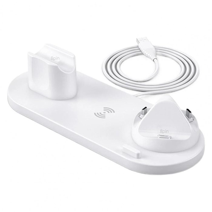 Estação de carregamento rápido por indução 6 em 1 para celular, relogio inteligente e tablets cor branco.