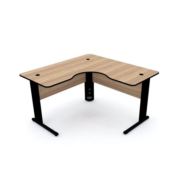 Tampo em MDPBP 15mm com perfil ergonsoft 180°. Pés tipo W com calhas para fiação, base oblonga e ponteiras reguláveis; pé central em aço em formato octogonal com furação para acoplar dispositivo de kit de energia.