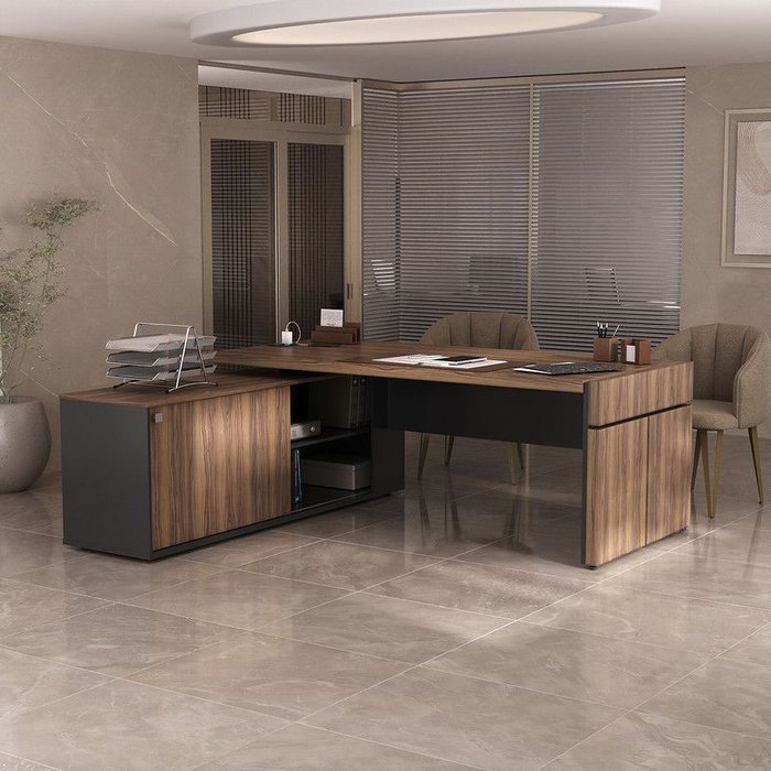 Laterais e tampo em Tamburato de 50mm de espessura garantem a qualidade de móveis de alto padrão. O revestimento feito em BP e as bordas de PVC asseguram resistência a impactos, atrito e umidade, fazendo com que seu móvel permaneça conservado e duradouro. Com design elegante e versátil, este produto pode ser usado nos mais variados tipos de escritório e também em seu home office."