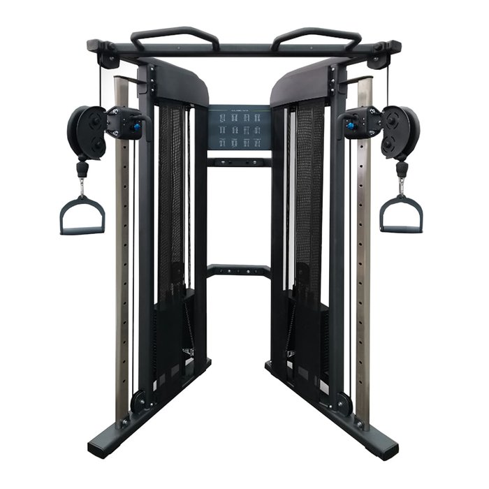Aparelho semiprofissional que permite trabalhar diferentes musculaturas de forma uni ou bilateral fazendo ajustes na altura(desde o chão até acima da estatura), peso e tipo de puxadores (corda, reto, formato “W”, etc.) - 2 Colunas de peso isoladas.