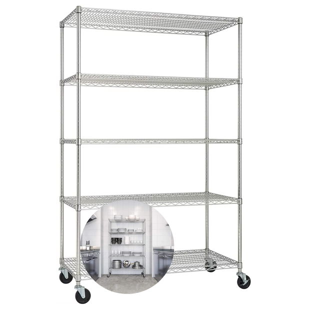 ESTANTE ORGANIZADORA, COM PRATELEIRAS DO TIPO COMERCIAL OU RESIDENCIAL ARAMADA. MODELO COM 5 PRATELEIRAS COM RODÍZIO.