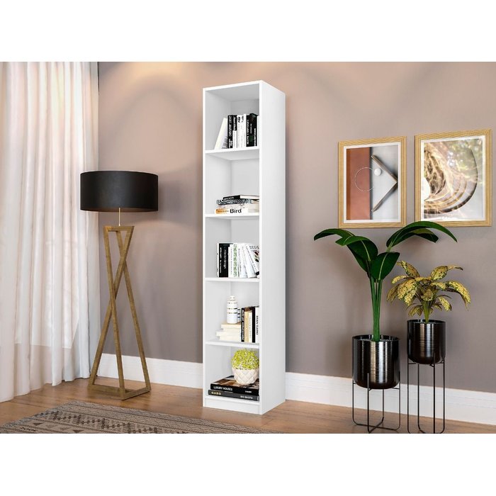 A Estante livreiro Multiuso Vertical 5 Divisórias Branco em MDF é um móvel funcional, feito com acabamento branco, que possui cinco prateleiras dispostas de forma vertical. Este tipo de estante é comumente utilizado para armazenamento e organização de livros, documentos, objetos decorativos ou utilitários.