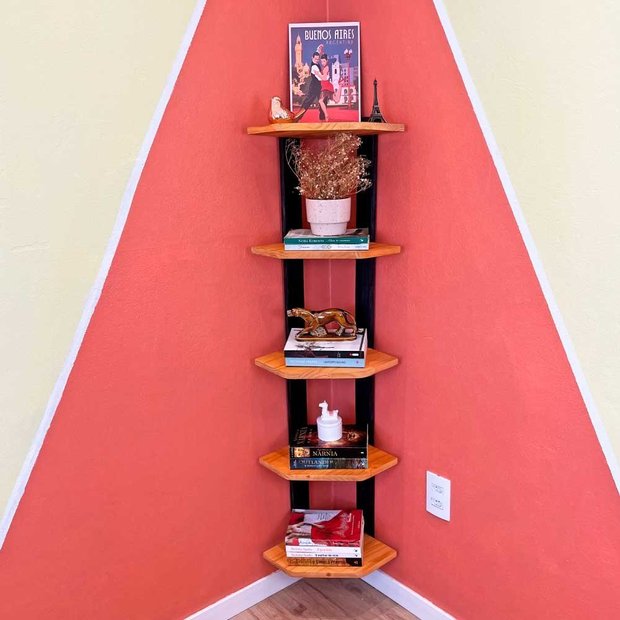 Todo canto da sua casa é perfeito para uma decoração legal e transformadora. Por isso existe a estante cantoneira, para aproveitar cada cantinho. A estante cantoneira foi criada para decorar quinas de parede. Feito 100% em madeira Pinus.