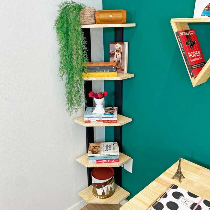 Todo canto da sua casa é perfeito para uma decoração legal e transformadora. Por isso existe a estante cantoneira, para aproveitar cada cantinho. A estante cantoneira foi criada para decorar quinas de parede. Feito 100% em madeira Pinus.