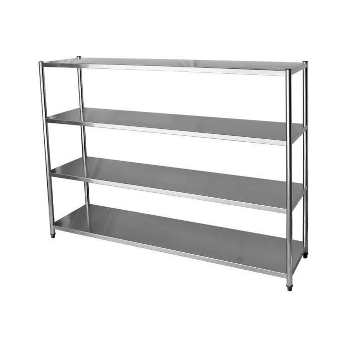 Estante de 1,5 metros de comprimento com 4 prateleiras lisas, produzida totalmente em Aço Inoxidável tipo 201 de alta qualidade e resistência. Suporta até 320 kg de carga, sendo 80 kg em cada prateleira.