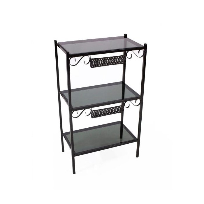 Estante em ferro com detalhes em junco e três prateleiras em vidro fumê