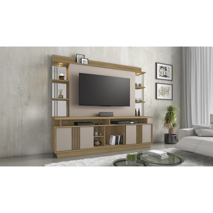 Estante Home Esplendor para TV de Até 65 Polegadas Seu centro de entretenimento merece estar bem organizado e com a decoração impecável, não é? A Estante Home Esplendor é garantia de uma sala de estar completa e perfeita para os momentos de lazer. Além do painel para televisão de até 65 polegadas, ela tem nichos para acomodar os aparelhos eletrônicos essenciais ao dia a dia e espaço interno para guardar os objetos que você quer manter sempre por perto. Já as prateleiras recebem bem os itens decorativos que dão aquele charme especial ao ambiente, como pequenos vasos, livros ou quadros. Tudo isso com visual elegante e coloração tradicional, características que tornam fácil a harmonização com os outros móveis do cômodo e contribuem para a composição do lar-style dos sonhos. Demais, né? - Dimensões do Produto Montado: 210cm (L) x 201cm (A) x 45cm (P); Diferenciais - MDP 15mm - Portas de correr com detalhe ripado - Tubo metálico - Tampo 40mm - Espelhos decorativos - Luminárias em LED - Prateleiras 25mm - Espaço para TV: 1500mm x 1085mm (LxA) - Recomenda-se TV até 65" - Peso 99Kg Montagem: Recomendamos que a montagem seja feita por profissional de sua confiança Instruções/Cuidados: Limpar com Pano Seco ou Levemente Umedecido. Não aplicar lustra móveis. Informações: Os objetos que ambientam as fotos não acompanham o produto