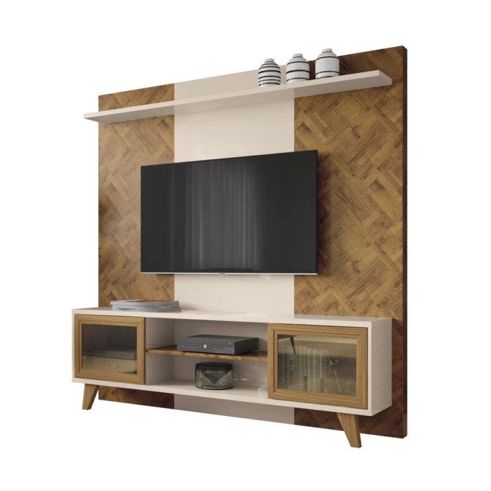 A Estante Home Painel para TV até 60 Pol. Marchê Chevron/Off White - HB Móveis, é o móvel que veio para renovar sua Sala de Estar, pois tem design arrojado e inspirador. Projetada para TVs de até 60 polegadas, conta com 2 portas em vidro reflecta emolduradas em MDF, tampo, base e prateleira superior em MDP 25 mm, excelente espaço para aparelhos eletrônicos ou objetos decorativos, pés de madeira maciça com acabamento envernizado e estrutura que garante maior durabilidade e resistência. Lançamento da HB Móveis, revestido com tom amadeirado para deixar sua sala mais aconchegante. Confira!