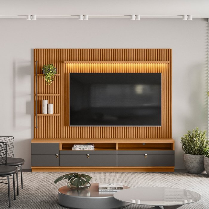 Rack com Painel Ripado 1 Modulo Lateral Esquerdo Ouro Preto Nature/Chumbo - Linea