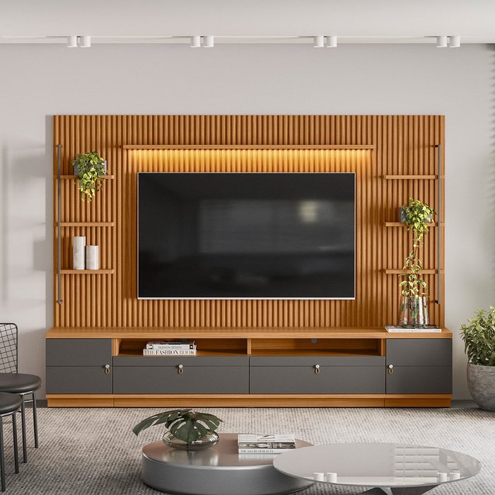 Rack com Painel Ripado 2 Modulo Lateral Ouro Preto Nature/Chumbo - Linea