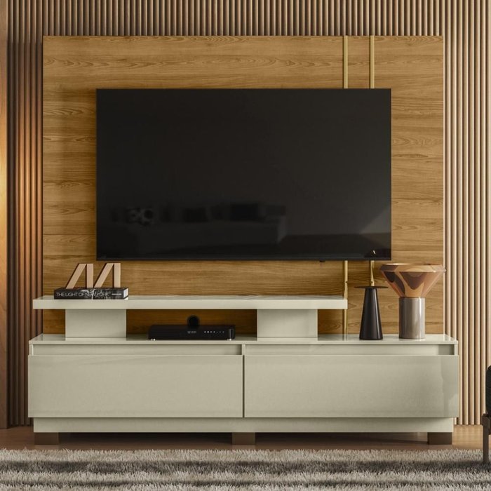 Estante Home Theater 2 Portas Com Espelho LED Frizz Plus A Estante Home Theater Frizz Plus é ideal para quem busca elevar o estilo e a funcionalidade do seu ambiente, com pintura de alta qualidade através do método DIP (Direct Inverse Printing), oferece um acabamento impecável e duradouro. Seus perfis com acabamento em Hot Stamping adicionam um toque de elegância e modernidade. Fabricado com painéis em MDP de 15 e 40mm, o produto é robusto e resistente. Além disso, as duas gavetas com corrediças telescópicas garantem um deslizamento suave e prático, proporcionando organização e fácil acesso aos seus objetos. Características: