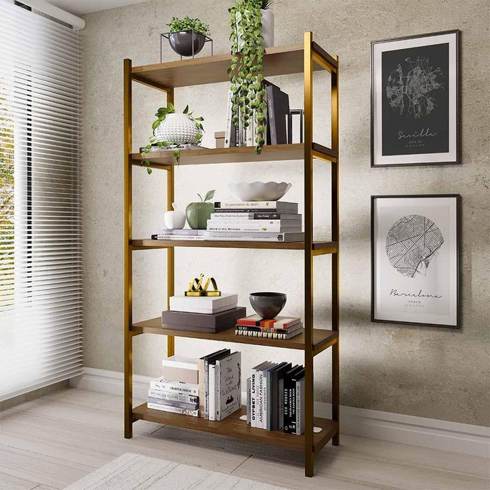 Estante Industrial 5 Prateleiras 90 cm Imbuia Dourado Garen Steel Mobile