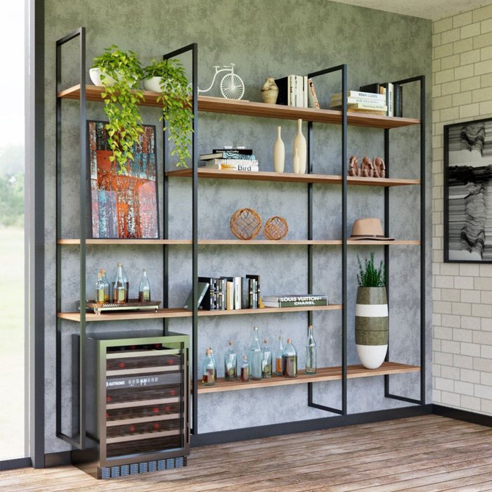 A alternância de tamanho dos tampos da estante e sua disposição possibilita variações no tamanho dos espaços e vãos das prateleiras, os quais permitem acomodar os mais diversos itens de decoração: livros, vasos, porta retratos, quadros, plantas e até uma adega refrigerada.