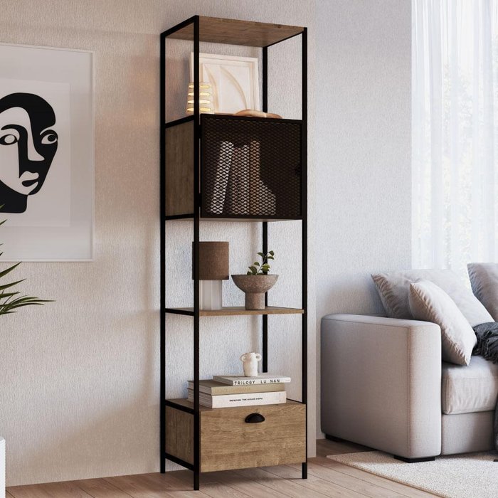 A Estante se destaca por seu estilo industrial que se inspira nas instalações de fábricas das grandes cidades. Conta com 1 porta e 3 nichos produzidos em MDP e é perfeita para decorar e organizar. Ideal para os amantes dessa tendência que mistura o rústico ao urbano, dando ainda mais personalidade ao seu espaço. As laterais e a porta da estante são fabricadas com Tubos de Aço. Para um ambiente moderno é necessário escolher móveis arrojados, únicos, que irão impressionar logo à primeira vista.