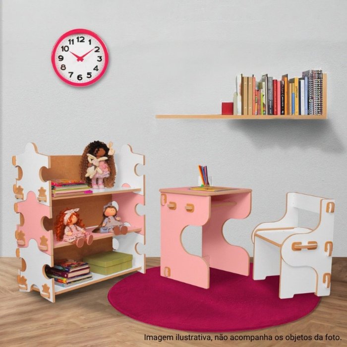 Monte facilmente sem parafusos ou cola, aproveitando momentos de união. Produzida em MDF laminado de alta qualidade, está disponível em cores encantadoras: Azul/Branco, Rosa/Branco e Verde/Branco.