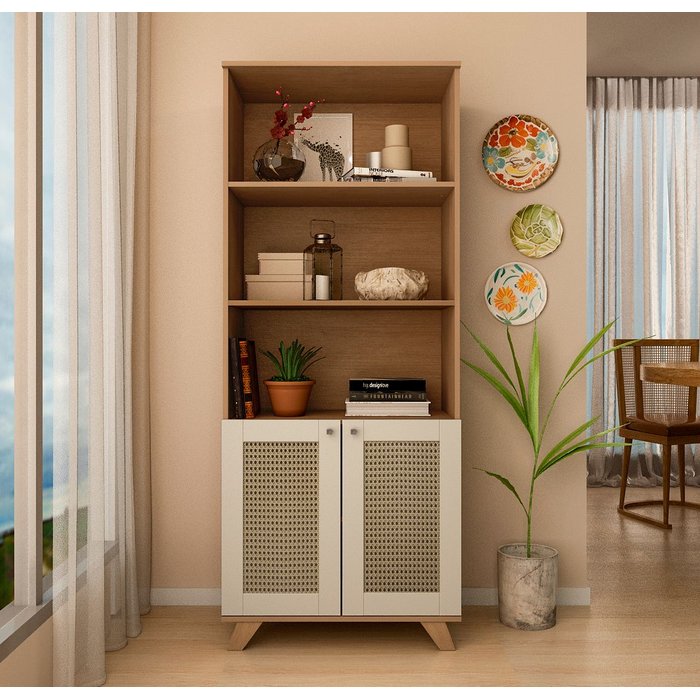 Estante Multiuso 3 Nichos, 2 Portas com pintura 3D palha Trama Artely Cinamomo/Off White