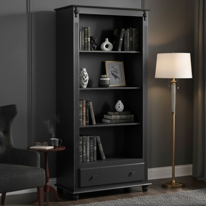 Estante para Livros de Madeira 3 Prateleiras 1 Gaveta Pés Torneados - Preto Laca