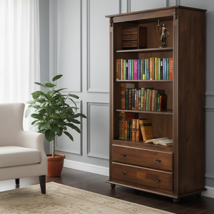 Organize seus livros e objetos de forma elegante com esta estante de madeira. Com um design clássico e funcional, ela é ideal para quem busca praticidade e sofisticação para seu ambiente. Possui 3 prateleiras amplas, perfeitas para armazenar livros, revistas, decorativos e muito mais. As 2 gavetas adicionais oferecem um espaço extra para guardar itens menores ou mais pessoais, mantendo seu ambiente organizado. Os pés torneados conferem um toque de charme e delicadeza, tornando a estante uma peça de destaque na decoração. Feita em madeira de alta qualidade, sua durabilidade e resistência são garantidas. Seja na sala de estar, escritório ou biblioteca, esta estante vai agregar funcionalidade e estilo ao seu espaço.