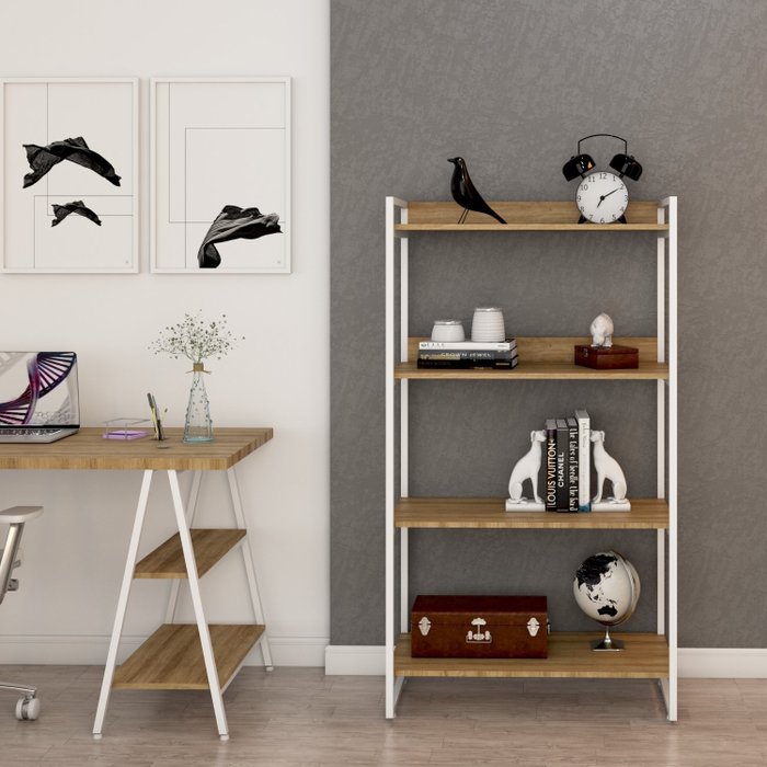 Estante para Livros Industrial 145cmx80cm 4 Prateleiras Kuadra Lamina Mel/Branco
