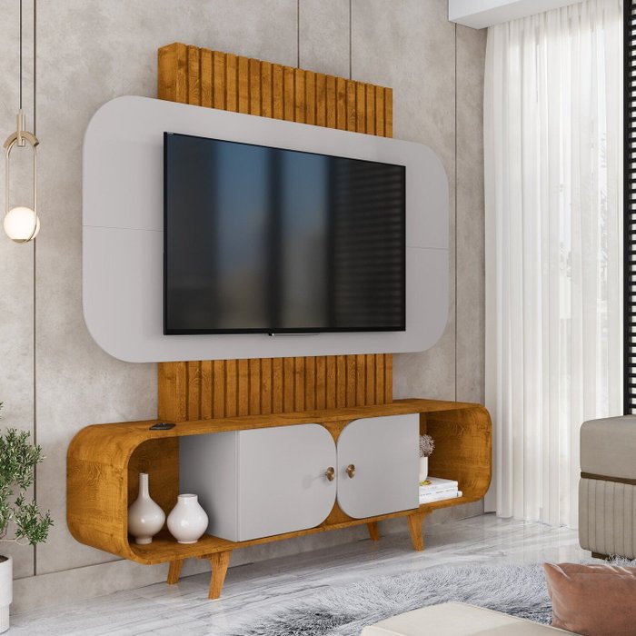 Estante para TV até 75 Polegadas Pés em Madeira Maciça Embaú Naturalle/Off-White