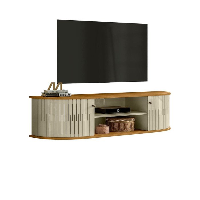com detalhes curvos, Puxadores em poliestireno, Suporta TVs de até 60".