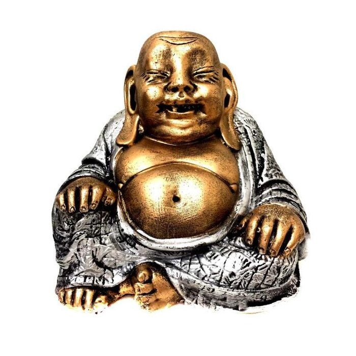 Estátua Buda Chinês Sorridente da Riqueza Dourado e Prateado 16cm