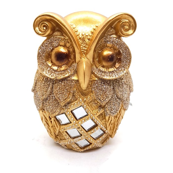 Enfeite decorativo no formato de uma coruja com aproximadamente 10 cm de altura e corpo fartamente decorado. Ideal para decoração de interiores.