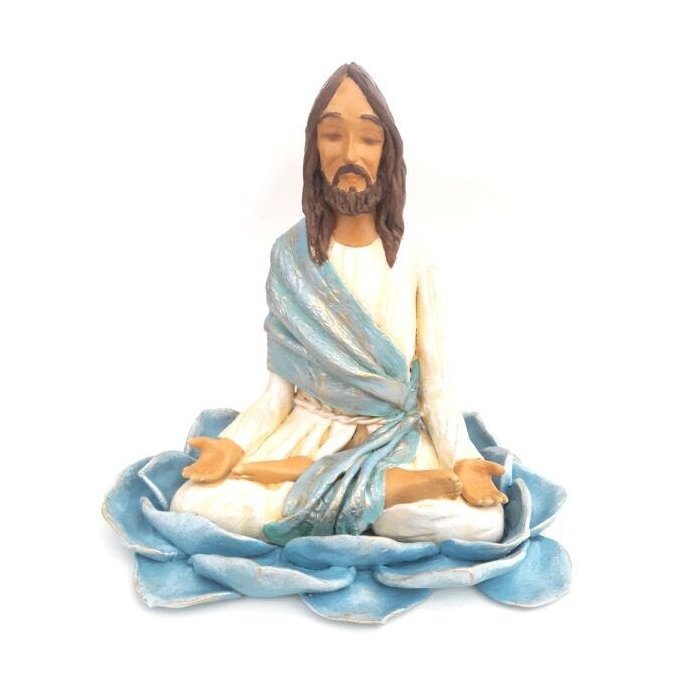 A imagem traz Jesus Cristo em posição de lótus e o significado mais importante da flor de lótus é pureza do corpo e da mente. Uma verdadeira obra-prima, produzida artesanalmente à mão, repleta de detalhes e características únicas em cada peça. Sob Jesus Cristo há uma bela e detalhada flor de lótus. Suaves toques dourados pincelam a peça para retratar a energia e a luz que esta peça inspira. As características, detalhes e cores podem variar suavemente por se tratar de uma peça 100% artesanal. Medidas Aproximadas: 18cm (altura), 18cm (largura) e 14cm (profundidade).