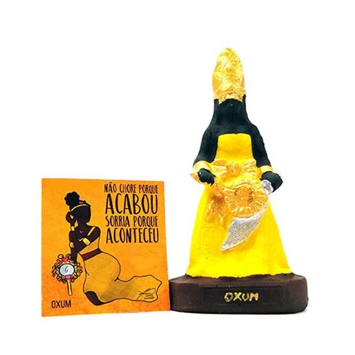 Oxum é uma orixá, é a rainha da água doce, dona dos rios e cachoeiras, cultuada no candomblé e também na umbanda, religiões de origem africana. Oxum é a segunda esposa de Xangô e representa a sabedoria e o poder feminino. Além disso, é vista como deusa do ouro e do jogo de búzios.Peça artesanal, produzida com amor e riqueza de detalhes incríveis.Medida aproximada: 10cm (altura)