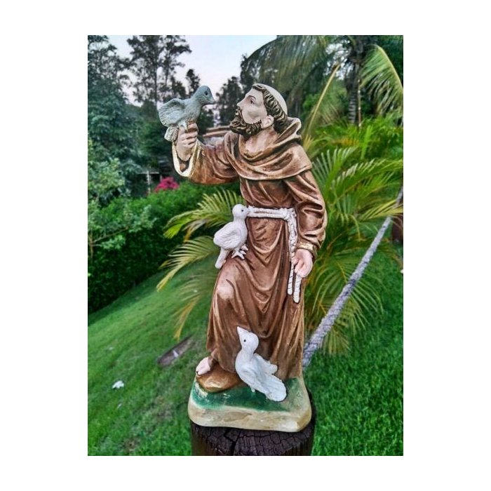 Altura :28 cm Largura :13 cm Profundidade: 9 cm Os animais na imagem de São Francisco representam seu amor pela Criação. São Francisco chamava a todas as criaturas de irmãos: irmão sol, irmã lua, irmão lobo, irmã água... Era comum a presença de animais em suas pregações. Por isso, os pássaros presentes nas imagens do santo representam todos os animais e a ligação de São Francisco com a natureza. Em algumas representações aparecem outros tipos de animais. No dia 4 de outubro, dia que a Igreja celebra São Francisco, o mundo inteiro comemora o dia dos animais. Por isso ele é o padroeiro da ecologia e do meio ambiente e patrono dos animais. Seu grande amor pela criação o fez escrever o 'Cântico das criaturas' e 'Irmão sol'.