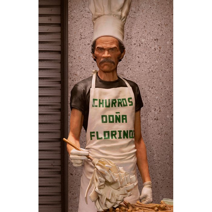 Devidamente uniformizado com avental e luvas brancas, trazendo na cabeça seu chapéu mestre cuca, o simpático rabugento vendedor de churros trabalha com sua singela mesinha de madeira próximo a vila onde mora, anunciando suas guloseimas e espantando insetos indesejados com seu espanador esfarrapado. Inspirado no primeiro episódio da sexta temporada de Chaves de 1978, A Sociedade Parte 1, ou no original La venta de churros Parte 1, a Iron Studios orgulhosamente apresenta a estátua "Seu Madruga Churros ver. - Chaves - Art Scale 1/10", com uma opção de cabeça extra exclusiva para trocar as feições do Madruga alegre ou irado.