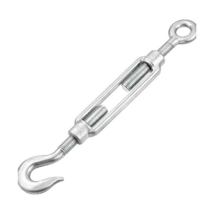 Produto: Esticador para cabo de aço/nMaterial: Aço carbono/nAcabamento: Galvanizado / Zincado/nSistema de ajuste: Rosca direita e esquerda/nTipos disponíveis: Gancho x Gancho, Gancho x Olhal, Olhal x Olhal/nAplicação: Tensionamento e regulagem de cabos de aço/nResistência: Alta resistência mecânica/nUso: Interno e externo/nAplicação