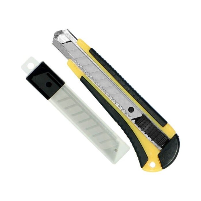 Descrição- Maior Segurança (trava) e poder de corte (lâmina larga).- Composição em Aço e Prolipropileno.- Corte em geral; Papéis, plásticos, couro e etc.- Possui lâmina de aço temperado com trava.- Fácil ajuste de corte.- Lâmina de 18 mmComposição: PVC e AçoMarca: 123Útil