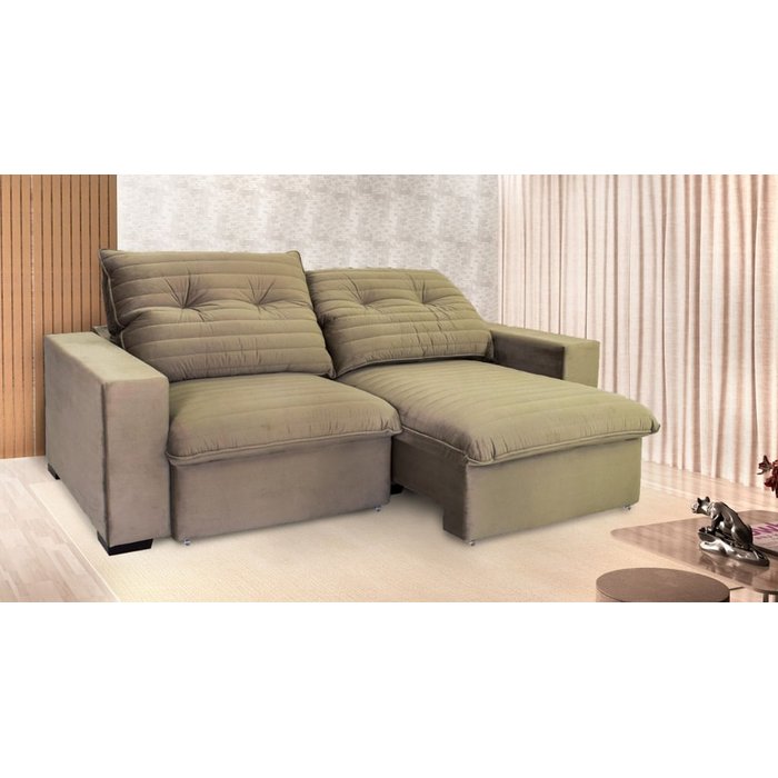Ele é muito espaçoso, medindo 2,60 metros de largura, encostos reclináveis. Além de tudo, ele é retrátil, chegando a medir aberto 1,77 m e com os pezinhos de silicone é ainda mais fácil o manuseio e uso no dia a dia.